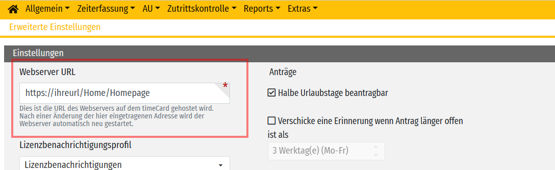 Bitte hier keine Unter-URL's, wie z.B. "https://ihreurl/Home/Timerecording" verwenden. Dies führt dazu, dass die timeCard GO App nicht auf den timeCard Server zugreifen kann.